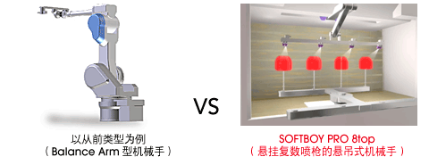 以2喷房生产为基准时,一般需要2台喷房和4台机械手。SOFTBOY PRO 8top 可以使用1台机械手处理2喷房的工作。因此,设备体积可以缩小1/4,再加上涂料的消耗量可以削减50%。
