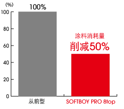 与从前的喷涂系统相比,SOFTBOY PRO 8top由于采用了旋转喷涂(R技术)的薄膜多层涂装技术,所以带来了涂料使用量削减50%等诸多优点。